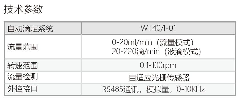 自動滴定系統(tǒng) WT40/I 通過自動控制儀設定液滴數(shù),傳感器監(jiān)測當前數(shù)據(jù)并反饋,微電腦芯片控制恒流泵輸出相應的液量,從而形成閉環(huán)控制,提供準確的流量,非常適合基于微小流量長時間精確計呈要求的應用。