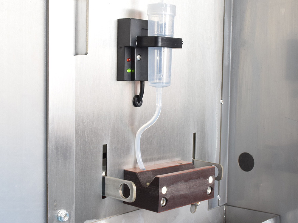 浸潤劑滴定組件由蠕動泵 + 儲液容器 + 導(dǎo)油管 + 木制油槽組成,通過泵的定量輸送將浸潤劑滴入油槽,紗線穿入油槽凹槽時浸沾助劑。紗線完全嵌入油槽凹槽的浸潤劑液層中,單絲級的包裹性強(qiáng),能讓浸潤劑均勻覆蓋每根玻璃纖維單絲(上油均勻度偏差≤1%),尤其適合細(xì)旦紗